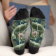 Aquarellgestaltung mit Kabinen vor grünem Waldhintergrund. Grüne Socken - perfekt für Ihren Tag im Wald. Oder um im Büro zu tragen, um Ihre Liebe der Natur auszudrücken.