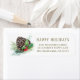 Rustikaler Winterwald, naturbelassene Weihnachtsfeiertage mit Kiefernzapfen, roten Heiligbeeren, grünen Blätter und Pinienbäumen mit einem "Happy Holidays"-Gruß in Goldschrift.