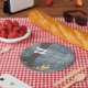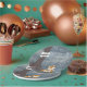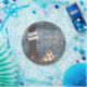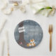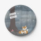 Baby-Duschen-Teller, der eine Illustration eines Mutter- und Babyfuchses snuggling ist unter einem Baum im Wald nachts umgeben durch Sterne kennzeichnet.