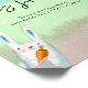 Geschlechtsneutrale Babydusche Ein Beispiel für ein Aquarellwald: Fuchs mit Heidelbeere in Pfoten, Bär mit Himbeere, Igel mit Birne, Hase mit Karotte. Der Aquarellhintergrund ist mehrfarbig.