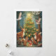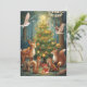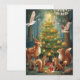 Dies ist eine flache Feiertagskarte. Die Rückseite ist leer. Die Vorderseite ist ein von KI generiertes Bild von Waldtieren, die die Feiertage um einen dekorierten Baum feiern. In der Ecke befindet sich ein Banner mit den Glückwünschen "Frohes Neues Jahr".