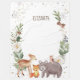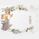 Das Design umfasst eine Gruppe von bezaubernden Waldfreunden (Hirsch, Bär, Marmelade, Fuchs, Eule) und üppig grüne Wasserfarben.