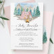 "Einladung von Waldtieren Hirschbärenblütendusche." Helle und luftige, weiße und hellpastellrosa Hintergründe mit Aquarellfarben rosa staubiges Zelt mit Pennenbanner, Pinienwald, Bergen und Himmel. Niedliche Waldtiere sind Camping zusammen, lass das Abenteuer beginnen! Hergestellt und entworfen von Audrey Jeanne Roberts, einer international bekannten und lizenzierten Künstlerin. Urheberrecht.