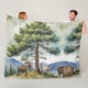 Waldtiere in den Bergen Fleece Blanket mit Aquarellbildern von Bär, Elche und Hirsch und einem Kiefer.
