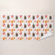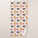 Farbenfrohe Kinder baden Handtuch-Set, mit einem weißen Badehandtuch mit orangefarbenen Füchsen, braunen Hedgehosen, Pfeilen, Eicheln, Pilzen und Blätter. Das Handtuch wird in einem weiß, orange, bräunlich und rot gestreiften Muster gefertigt, und das Waschlappen hat einen großen Hedgegriff auf weißem Hintergrund. Das Set ist für ein kleines Kinderbad geeignet.