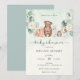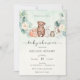 Babyduscheinladung mit Aquarellkranz eukalyptus, weißen Blume und bezaubernden Abbildungen von Waldtieren. Passen Sie Ihre Veranstaltungsdetails an, um die Mutter zu feiern, die Sie sein werden.
