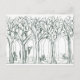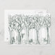 Eine Winterpost-Karte mit einem schwarzen Stift und einer Tinte, die von einem Wald mit Waldtieren wie Kaninchen und Reh im Schnee zeichne.