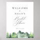 Rustikale, schicke Aquarellwald- und Berglandschaft-Szene, personalisiertes Begrüßungspposter. Elegante Signatur Kalligraphie "Brautparty" Grafik.