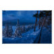 Winterlandschaft mit schneebedeckten Kiefern und Tannenbäumen in einem Mondlicht in der Sternennacht. Panoramasicht auf den Nadelwald mit Holzweg nahe der Küste gegen den schönen Nachthimmel mit Sternen