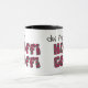 Eine ansprechende weiße Ringer-Tasse mit schwarzem Lip und Handle und 'I like coffee' in the walish language'. Die Buchstaben sind mit einem roten und grünen geometrischen Muster gefüllt. Sie können die Hintergrundfarbe lieber über die Schaltfläche Anpassen und dann über die Schaltfläche Bearbeiten > Hintergrund ändern.