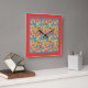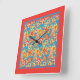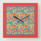 Eine quadratische Wall-Uhr mit einem fröhlichen, rundum gelben, roten, orangefarbenen Blumenmuster auf einem hellen türkisfarbenen Hintergrund, von Judy Adamson in einer handbemalten PapierCollage.