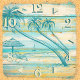 Uhr der Strandpromenade. Einzigartige Uhr mit Sand aus Imitaten bestickt, mit Sessel, Palmen und wunderschönem Himmel auf Imitaten mit blauen Holzbalken.