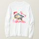 Eine Galerie trägt eine Weihnachtsmannmütze und der Text lautet "Fröhliche Fishmas" auf diesem lustigen "hässlichen Pullover".