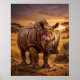 Monumentale Walnuss-Nashorn-Kunst, die ein mächtiges Nashorn zeigt, geformt aus rissigen Walnussschalen, warmen Nussstrukturen, polierten braunen Oberflächen und skulpturierten Horn-Details. In leuchtenden Ernteebenen mit Akazienbäumen, goldenen Gräsern, felsigen Vorsprüngen, rustikalen Wagen und Sonnenuntergangshimmel platziert, wirkt diese Fantasie-Kreatur kraftvoll und majestätisch. Perfekt für Statement-Wände, Büros, rustikale Häuser, Esszimmer, männliche Dekoration oder Sammler von auffälliger Kunst mit essbaren Tieren.