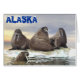 Ein digitales Gemälde von vier Walrusen, Wilson, Winston, Winthrop, Erholung auf einer Eismehle, mit dem vierten Bruder Wilbur, im Wasser. Auch der blauer Text "Alaska" erscheint mit Schneekoppel. Der Walrus (Odobenus rosmarus) ist in seiner Reichweite umpolar, aber er befindet sich in geografisch getrennten Gebieten. Der Walrus, die einzige lebende Art der Familie der Odobenidae und der Gattung Odobenus, ist in drei Unterarten unterteilt: den Atlantik (O. rosmarus rosmarus), der die Küstenregionen Nordostatadas und Grönlands bewohnt, den Pazifik Walrus (O. rosmarus divergens), der in den Bering- und Chukchi-Meeren vorkommt, und O. rosmarus Laptevi lebt im Laptev-Meer. Der Walrus wird sofort durch seine berühmten Stoßzähne, Whiskers und große Masse erkannt. Erwachsene Pazifische Männchen können bis zu 3.700 lb (1.700 kg) wiegen. Sie sind ein langlebiges, soziales Tier und gelten als eine Schlüsselart. Walrusen sind Zimtbraun.