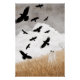 Walter The Lovely Ghost sucht ein Feld und hat die Krähen gestört, die im grauen Herbsthimmel fliegen.