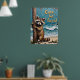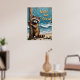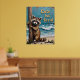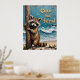 Dieses bezaubernde Gemälde besticht durch einen Waschbär mit detailliertem braunem und weißem Fell, der an einem verwitterten Holzpfosten an einem Sandstrand festhält. Die Ozeanwellen brechen sanft im Hintergrund unter einem hellen, teilweise bewölkten Himmel ab. Der Text "Niedlich, aber wild" ist in einem stylisierten gelben Schriftart über dem Waschbär geschrieben. Das Kunstwerk hat dicke, strukturierte Pinselstriche, die ihm ein skurriles und leicht windgewitztes Gefühl verleihen.