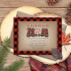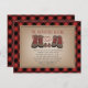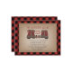 Darstellung eines Babypaares zwischen zwei erwachsenen Wanderstiefeln mit roten Schnürsenkeln in Herzform. Der Hintergrund ist mit rotem und schwarzem Büffel inspiriert, karierter Rand und gegenüber. Roter Text oben sagt: "Das Abenteuer beginnt"