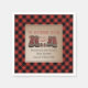 Darstellung eines Babypaares zwischen zwei erwachsenen Wanderstiefeln mit roten Schnürsenkeln in Herzform. Der Hintergrund ist mit kariertem roten und schwarzen Büffel inspiriert. Roter Text oben sagt: "Das Abenteuer beginnt"