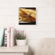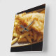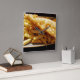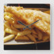 Ein nahes Foto von Fisch und Chips, gedruckt auf einer quadratischen Wanduhr.
