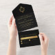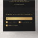 Eine Vintage, elegante und ungewöhnliche Schwarz-Gold-Hochzeitseinladung mit einem Monogramm in einem Vintagen Imitat goldenes Wappen auf beiden Seiten der Falte und einem abnehmbaren UAWG mit Imitaten goldenen Folienplätzen. Der Text ist golden (außer M). Der Hintergrund ist schwarz. Wenn gefaltet, sieht es wie ein Umschlag aus, mit dem Hochzeitsmonogramm im Wappen auf der Falte gedruckt und per Post verschickt werden kann. Die abnehmbare UAWG hat auf der Rückseite die Adresse gedruckt und auch einen Platz für die Briefmarke, sodass sie als Postkarte per Post verschickt werden kann.