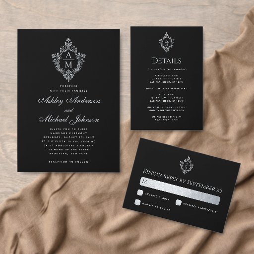 Black Faux Silver Crest Monogram Wedding SuiteDesignt von Artifex Designs