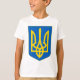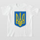Patriotisches ukrainisches Wappen. Wappen der Ukraine. Kleinere Wappen der Ukraine, die so genannte Tryzub. Ein stilisiertes Trident-Symbol in Gold auf einem Hintergrund blau.