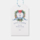 Custom Watercolor Wappen Geschenk Tag mit Winter Greenery und Red Striping Bow Fügen Sie eine personalisierte Touch zu Ihren Urlaubspendern mit diesem eleganten, benutzerdefinierten Aquarell Wappen Geschenketikett. An der Vorderseite befindet sich ein hübsch handgemaltes Wappen, das mit einem rot gestreiften Bogen, einer Winterlandschaft und einem zarten blauen Band, das Ihren Familiennamen zeigt, geschmückt ist. Eine individuell anpassbare Bühne nimmt das Zentrum ein und macht dieses Tag für Ihre Familie oder den Empfänger wirklich einzigartig. Unter dem Wappen befindet sich ein benutzerdefinierbarer Absendername und genügend Platz, um den Namen des Empfängers für eine durchdachte Präsentation zu schreiben. Die Rückseite des Tags ergänzt das Design durch ein abgestimmtes blau-weiß gestreiftes Muster, das Ihren Geschenken einen festlichen Flair verleiht. Diese Geschenkmarken sind perfekt für Feierlichkeiten, Familienfeiern oder personalisierte Ansammlungen geeignet und vereinen Kunst mit Praxisnähe. Pair sie mit Ihrem Lieblingspapier für eine zusammenhängende und raffinierte Geschenkpräsentation. Diese individuell gestaltbaren Geschenketiketten sind ideal für jeden, der eine personalisierte und kreative Touch zu seiner Geschenkidee im Urlaub hinzufügen möchte.