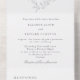 Eine elegante und traditionelle Einladung zur Hochzeit mit einem Schild-Wappen mit hellgrauen Blätter und dem Monogramm in der Mitte. Leaf-Motive verteilen sich über das gesamte Design, mit einem praktischen Abreißen von uAwg. Personalisieren Sie Ihre Daten in grauem Text.