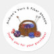 Runde "danke" Aufkleber mit Strickthema. Ein Garnkorb, Garnbälle mit Stricknadeln ist das Bild in der Mitte von weißen Aufklebern, die in zwei Größen kommen. Passen Sie den Text an, der sich oben und unten um den Shop herum kurbelt, mit dem Namen des Shops und "Vielen Dank für Ihren Kauf".