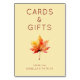 This wedding tabletop sign features a minimalist design with a warm beige background, creating an inviting and elegant atmosphere. At the center is a beautifully detailed watercolor-style illustration of an autumn leaf in vibrant reds, oranges, and yellows, evoking a sense of seasonal warmth. The text "CARDS & GIFTS" is prominently displayed at the top in bold serif font, while "thank you" appears below in a gentle sans-serif style, conveying gratitude. Perfect for expressing appreciation during the fall season, this sign combines artistic flair with understated sophistication, making it ideal for weddings or thank-you events.