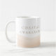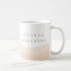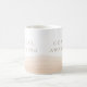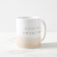 Beach inspired neutral drinkware in crisp white with a blush beige wave band grounding the base and taupe serif lettering reading Coastal Awakening. Clean coastal styling pairs easily with linen kitchens, light wood trays, and morning coffee rituals in airy seaside or lake house settings.