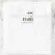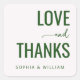 This elegant wedding sticker features a clean, minimalist design with a white background that highlights the text. The color palette includes deep and light greens, creating a harmonious contrast. Typography plays a key role, with bold sans-serif fonts for "LOVE" and "THANKS," complemented by a cursive script for "and." The overall mood is warm and celebratory, perfect for expressing gratitude at your special event.