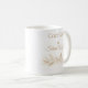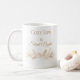 A white ceramic mug with taupe and gold watercolor pine sprigs along the base and the phrase “Cozy Sips & Silent Nights” in a soft script and serif mix. Its warm neutral palette suits seasonal mornings and adds a refined holiday touch to everyday winter routines.