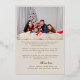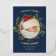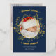 Eine moderne, süße Babyankündigung mit Winterurlaubsthema, mit einem skurrilen, handgezeichnet, winterbotanischen Rahmen mit echter Goldfolie, moderner Kalligraphie und Typografie für den Titel: "Warmest Wings & Baby Kisses" mit echter Goldfolie auch auf marineblarem Hintergrund. Vorlagen für zwei Fotos.
