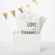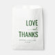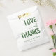Diese Hochzeitstasche zeichnet sich durch ein sauberes, minimalistisches Design mit weißem Hintergrund und kühner grüner Typografie aus. Die Wörter "LOVE" und "THANKS" werden in großen, großgeschriebenen Buchstaben prominent dargestellt, während das Wort "and" elegant in Kursivschrift geschrieben ist, wodurch ein ausgewogenes und modernes Aussehen entsteht. Anpassbare Platzhalter für Namen und Daten ermöglichen eine Personalisierung, wodurch es perfekt ist, um sich bei Ihrem besonderen Ereignis bedanken zu können. Die allgemeine Stimmung ist warm und herzlich, ideal, um Liebe und Wertschätzung zu feiern.
