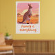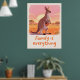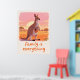 Ein sanftes Känguru mit einem lächelnden Joey in ihrem Beutel steht vor einem pfirsichrosa-farbenen Outback-Sonnenuntergang, gepaart mit der herzlichen handgeschriebenen Botschaft „Familie ist alles“ für gemütliche Kinderzimmer- und Wohnzimmer-Dekoration. Sanfte warme Töne, texturierte Illustration und klare Themen-Schlüsselwörter erhöhen die emotionale Anziehungskraft und die Sichtbarkeit in Suchergebnissen, während sie den Zazzle-Metadaten-Richtlinien folgen.