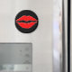 Ein runder Magnet mit Frauenlippenprint auf schwarzem Hintergrund.