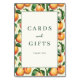 Dieses Hochzeitstisch-Schild verfügt über ein charmantes Design mit einem zentralen weißen Quadrat, das von einem Raster aus Pfirsich-Illustrationen in warmen orange- und grünen Tönen gerahmt wird. Die elegante Serif-Typografie liest "Cards and Gifts" mit einem herzlichen "Thank You" darunter und schafft einen klassischen und einladenden Look, der perfekt ist, um Dankbarkeit auf Ihrer Veranstaltung auszudrücken. Die realistische und dennoch künstlerische Darstellung von Pfirsichen verleiht eine Note natürlicher Schönheit, während die harmonische Farbpalette Wärme und Wertschätzung hervorruft und es zu einer idealen Ergänzung für jede Feier macht.