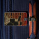 Ein musikalisches Notenmuster auf einem geröteten, texturierten Hintergrund in warmen Farbtönen betont die Silhouette des schwarzen Drum Set, die im Vordergrund dieses Designs Set. Personalisieren Sie mit Ihrem eigenen Namen und/oder anderen Text auf der Rückseite.