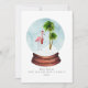 Illustration einer Schneekugel mit Flamingo und Palmen im Inneren.
