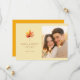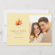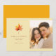 Diese Hochzeit "Save the Date"-Karte zeigt ein geteiltes Layout mit einer künstlerischen Ahornblatt-Illustration auf der linken Seite, die in warmen Herbsttönen in Rot, Orange und Gelb gehalten ist. Die rechte Seite zeigt einen Fotoplatzhalter für ein Paar vor einem hellen Beige-Hintergrund, der die weiche Farbpalette aus Gelb- und Cremetönen ergänzt. Das Design verbindet modernen Minimalismus mit rustikalem Charme und verwendet elegante Serifenschriften, um anpassbare Details wie Namen und Daten anzuzeigen. Die gemütliche und intime Atmosphäre macht sie perfekt, um Liebe und Verbindlichkeit zu feiern.