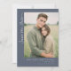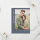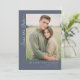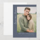 Dieses Design für die Hochzeitseinladung "Save the Date" zeigt ein zentrales Foto von zwei Personen in einer Outdoor-Umgebung, umgeben von hohem Gras, gerahmt von einem rechteckigen Rahmen auf einem gedämpften dunkelgrau-blauen Hintergrund. Das Layout ist vertikal ausgerichtet mit eleganter Kursivschrift in der oberen linken Ecke, die "Save the Date" liest, und anpassbaren Textelementen für Namen, Daten und Ort, die strategisch am unteren Ende platziert sind. Die Farbpalette umfasst natürliche Grüntöne aus der Fotografie, ergänzt durch neutrale Grau- und Weißtöne im Text, wodurch ein moderner minimalistischer Stil mit rustikalem Charme entsteht. Die Typografie kombiniert Serif- und Sans-Serif-Schriftarten, um die Aufmerksamkeit reibungslos über das Design zu lenken und Wärme und Vorfreude zu wecken. Perfekt für Paare, die ihre freudige Nachricht