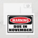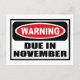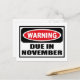 Warnung WÄHREND IN NOVEMBER Postcard können Sie anpassen unter www.WarningSignShirts.com und verfügt über ein rotes und schwarzes Warnzeichen und DUE IN NOVEMBER in fett schwarzen Buchstaben, um die Welt zu warnen. Sie können auch Ihr eigenes Warnzeichen Postcard mit dem gewollt Text anpassen.