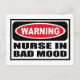 Warnung NURSE IN BAD MOOD Postcard können Sie anpassen unter www.WarningSignShirts.com und verfügt über ein rotes und schwarzes Warnzeichen und NURSE IN BAD MOOD in fett schwarzen Buchstaben, um die Welt zu warnen. Sie können auch Ihr eigenes Warnzeichen Postcard mit dem gewollt Text anpassen.