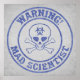 Warnung - Mad Scientist - in bedrücktem Blau und Grau mit Biogefährdung Symbol Schädel und Kreuzknochen.