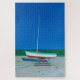 Ein Gemälde eines einzelnen Segelboots in einer Bootswerft an einem späten Frühlingstag mit einem tiefblauen Himmel im Hintergrund. Das Kunstwerk handelt davon, auf den Sommerbeginn in New England und den Spaß auf dem Wasser zu warten, der mit dem Leben in einer Küstenstadt einhergeht.