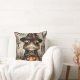 Warts & Wonders Throw Kissen Ein mit Augen Frosch in einem schwarzen Anzug und mit einem Schädel überzogene Hexenhut, die auf einer glühenden Jack-o'-Laterne aufragen, umgeben von geistreichen Figuren, alten Papierschrott und flackerndem Laternenlicht. Die Szene mit einem zweiten Kürbis, einem verwinkelten Geist und verstreuten Halloween-Relikten in der Nähe verbindet gotische Laune mit magischem Unfug. Schattige Schatten und handgeschriebene Notizen verleihen diesem bezaubernden Moment der spöttischen Stille ein Geheimnis.