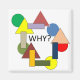 Ein Array aus farbenfrohen geometrischen Formen, die in einem Kreis angeordnet sind, umgibt das Wort 'WARUM?' in der Mitte. Die Formen umfassen Dreiecke, Kreise und Rechtecke in verschiedenen Farben.