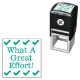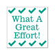 Dieses positive Gummi Briefmarke Design zeigt die Lobesbotschaft "Was für ein tolles Bemühen!". Es enthält auch ein dekoratives Auswahlfeldmuster. Es könnte von einem Lehrer, Pädagogen oder Tutor verwendet werden, um anzuzeigen, dass der Schüler gut abgeschnitten hat.